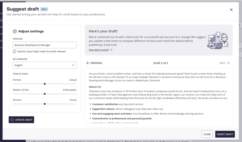 Tekoälypohjainen ilmoitustyökalu auttaa sinua luomaan älykkäämpiä työpaikkailmoituksia, jotka on optimoitu kohdeyleisöllesi.